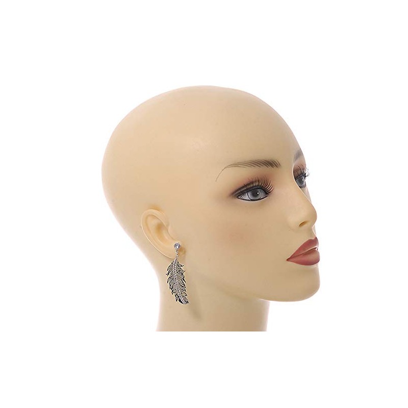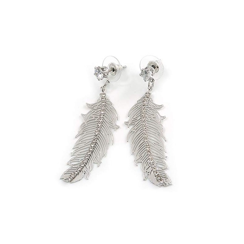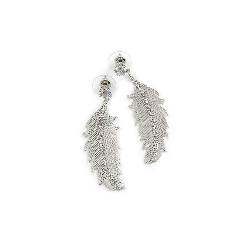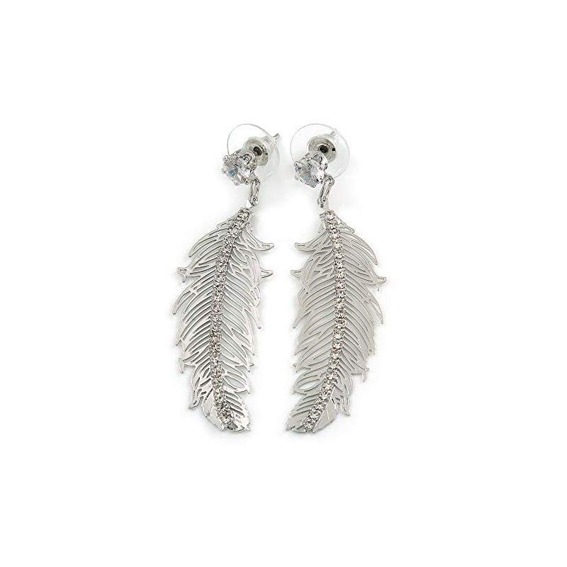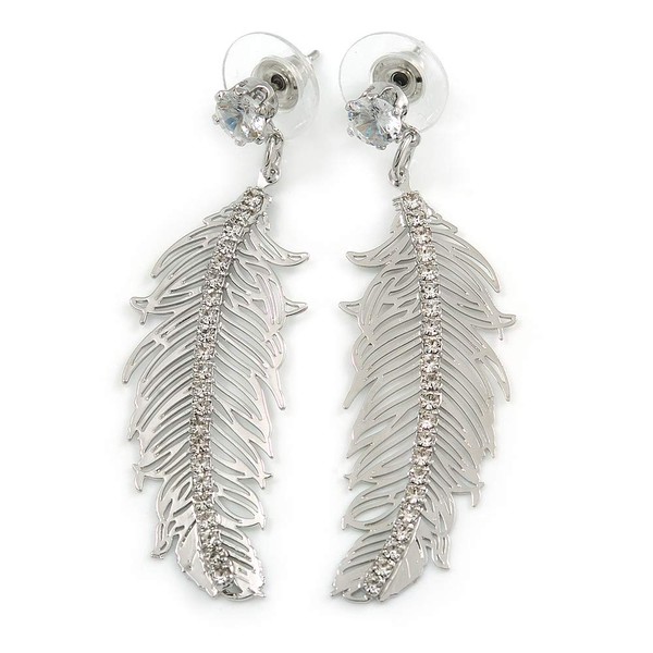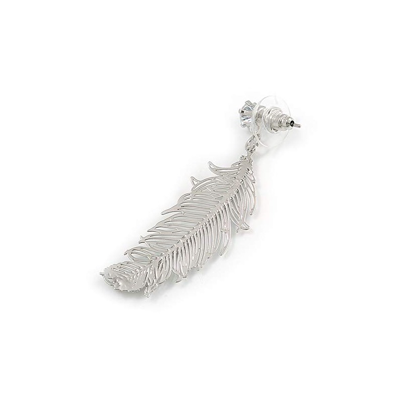 Silver Tone Clear Crystal Delicate Feather Drop Earrings - 50mm Long