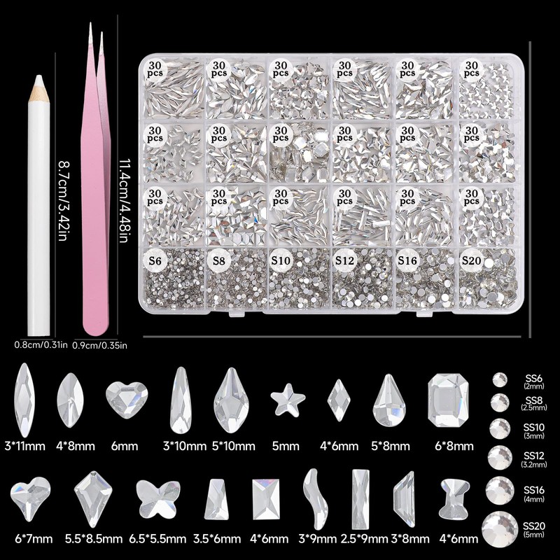 The set contains about 18 grids 540pcs multi shapes silver large nail art rhinestones with 30pcs per grid and 6 grids silver half round gems. 1 tweezer and pickup pencil is equipped for your convenience to stick them to your nail