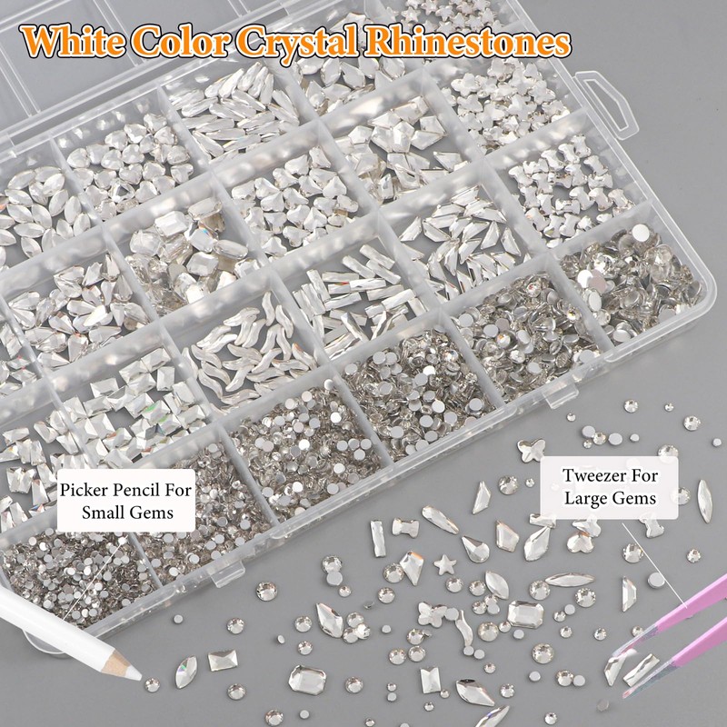 - Silver Nail Art Rhinestones Kit: The set contains about 18 grids 540pcs multi shapes silver large nail art rhinestones with 30pcs per grid and 6 grids silver half round gems. 1 tweezer and pickup pencil is equipped for your convenience to stick them to your nail