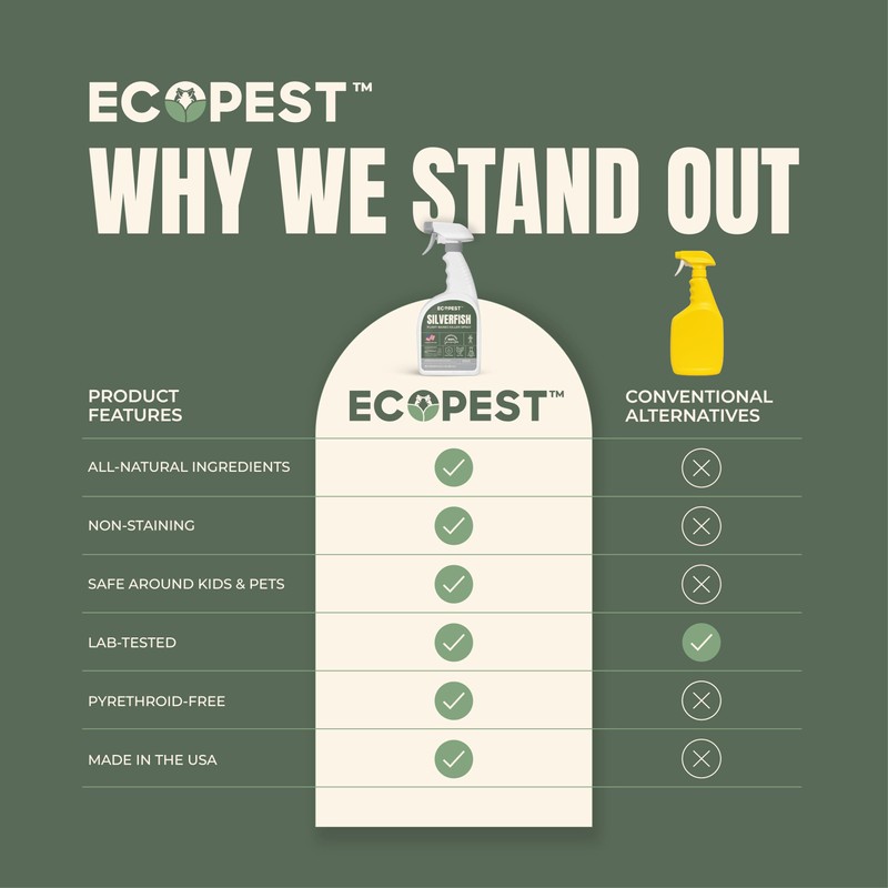 ALL-NATURAL FORMULA, FAMILY AND PET FRIENDLY. Tough on silverfish, gentle on you. Made with natural essential oils, including clove oil and cottonseed oil, this botanical biopesticide provides peace of mind for those with kids and pets at home. Common synthetic pesticide ingredients can pose health risks like neurotoxicity and endocrine disruption and can be toxic to aquatic life, raising environmental concerns. Unlike conventional pesticides, this spray is free of synthetic pyrethroids so it’s safer for your home, your family, your pets, and the environment. Effective pest control without compromise.