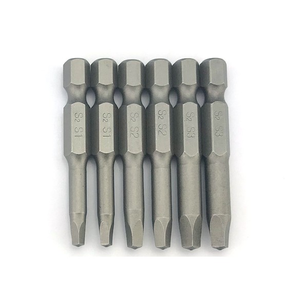 The Square Head Screwdriver Bits are made of S2 alloy steel. Dimensions: 2 x S1: 2.4mm - 2 in 2 x S2: 3.0mm - 2 in 2 x S3: 3.4mm - 2 in.