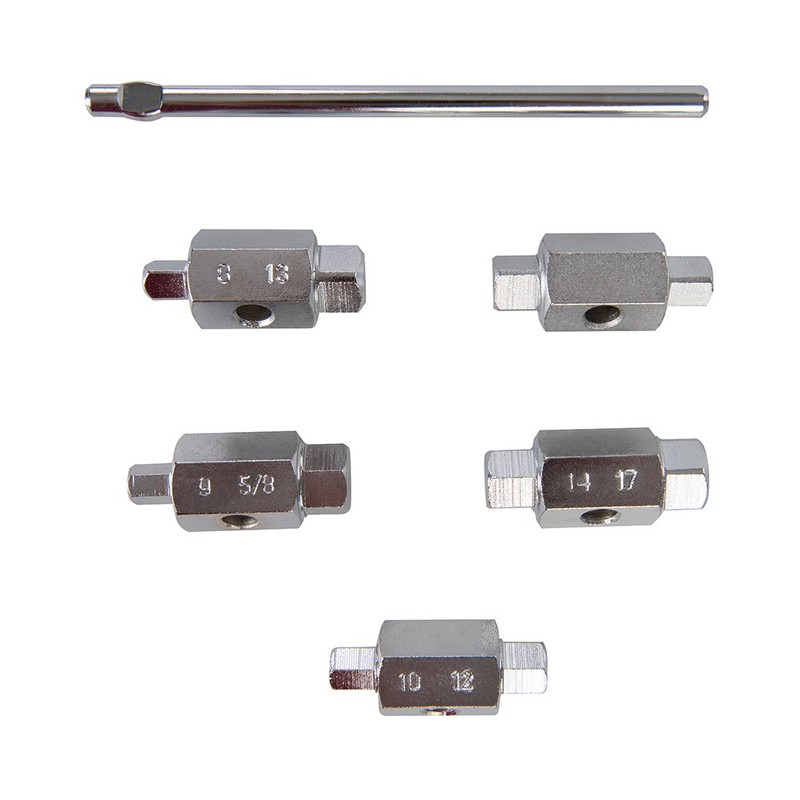 - Includes hex: 14 x 17mm, 10 x 12mm & 9mm x 5/8"; square: 8 x 13mm & 3/8" x 11mm