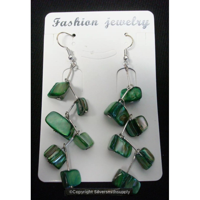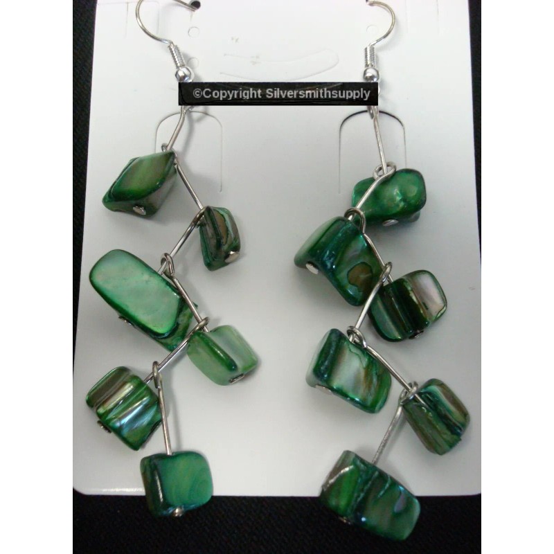 3 inch wired dangle earrings, natural Abalone sea shell baroque shaped nuggets.  Dyed Emerald green, wired with eye pins and hanging on fish hook earring wires..