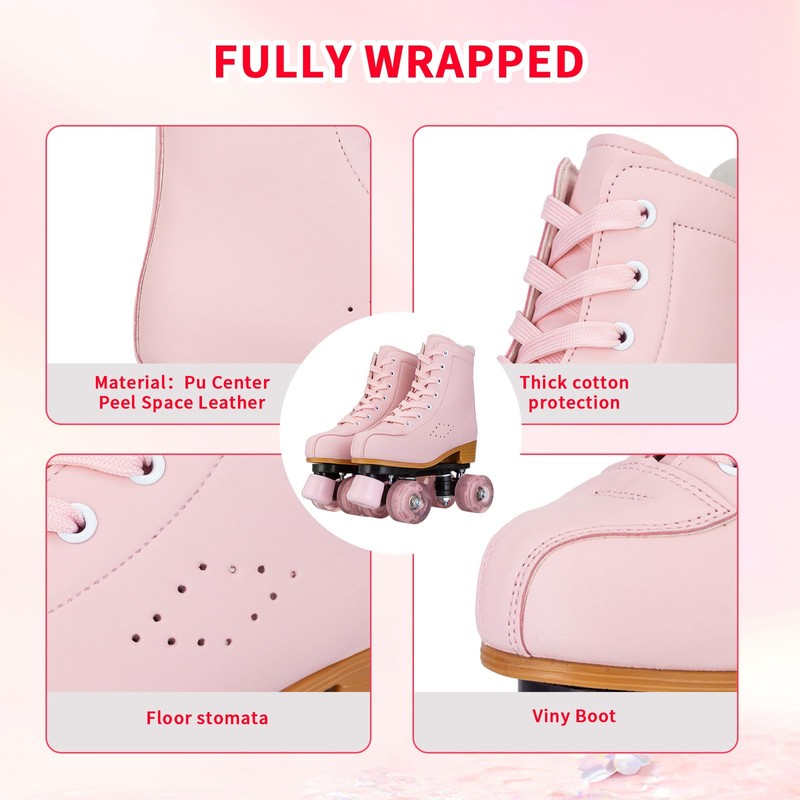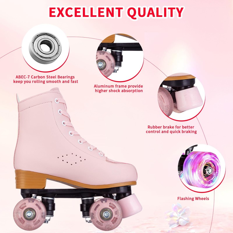 - ❤Everywhere You Want To Be: Our PU wheels and toe stops are ideal for both indoor and outdoor use. The skate features a traditional high top profile boot to support your ankles that allows you to adjust the fit as you go. So you can cruise the beach boardwalk, rollerskate at the park, or speed around the rink in true glam style
