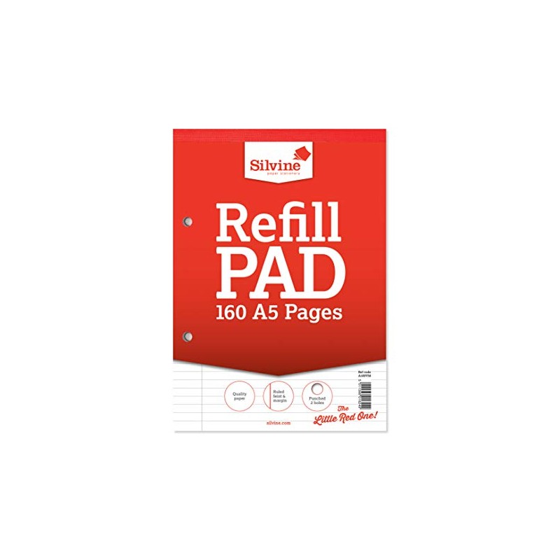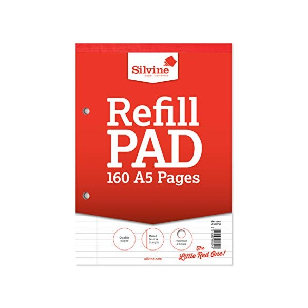 Silvine 160 Page A5 Refill Pad, Head Bound and Punched 2 Holes. Ruled 8mm Feint with Margin. Ref A5RPFM, White