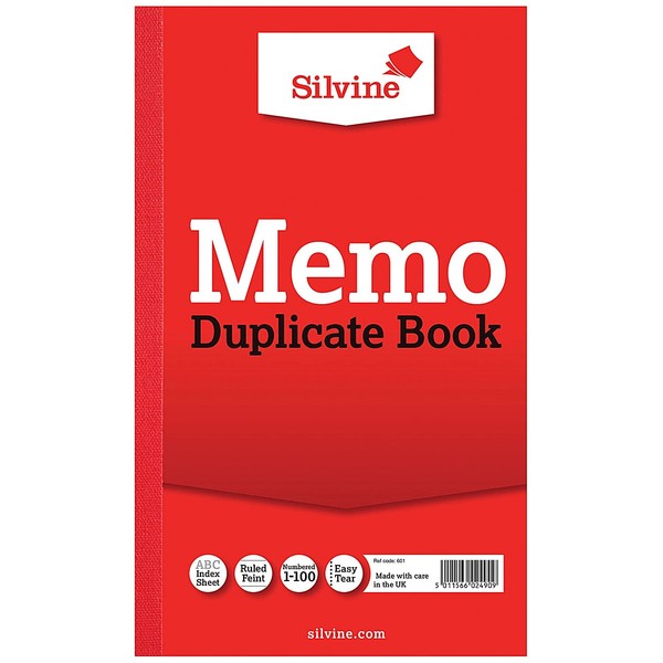 - Silvine Duplicate Book - Memo. Manufactured from quality bank paper with laminated Red covers. Features include, white pages numbered from 1 to 100 with an index sheet and carbon paper. Ruled Feint. Size: 210x127mm (8.25x 5"). Ref: 601.