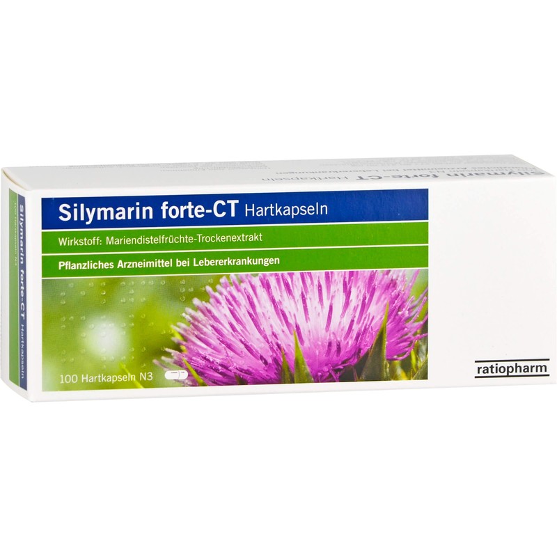 Silymarin forte-CT Hartkapseln. Wirkstoff: Mariendistelfrüchte-Trockenextrakt. Anwendungsgebiete: zur unterstützenden Behandlung bei chronisch-entzündlichen Lebererkrankungen, Leberzirrhose und toxischen (durch Lebergifte verursachten) Leberschäden.