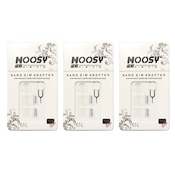 SIM Card Adapter KIT 3-Pack by Noosy (9 Total Adapters: Nano to Micro, Nano to Regular, Micro to Regular) with SIM Extractor/Pin Ejector (White)
