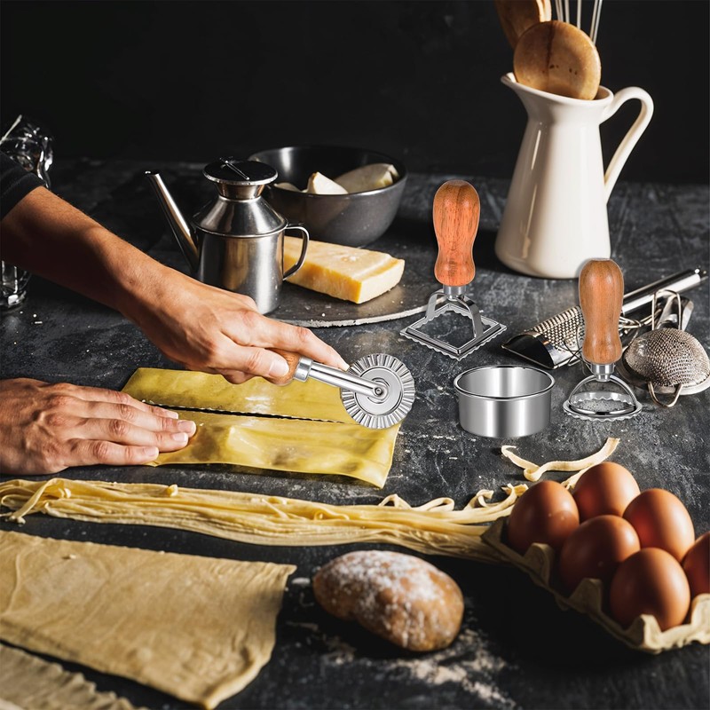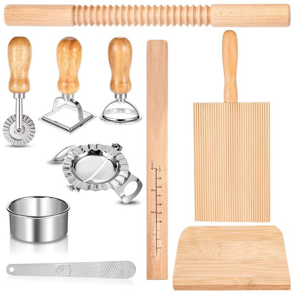 - 【Pasta Making Tool Set】You will receive a threaded rolling pin, a rolling pin with scales, a gnocchi board, a dough scraper, a dumpling's skin print, a dumpling maker, a stuffing spoon and 3 pieces of ravioli stamp maker cutter. These pasta tools combined can meet your pasta, ravioli, and dumpling-making needs.