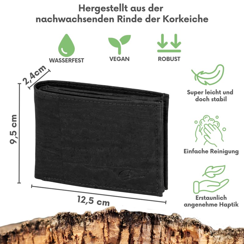 - Especially easy to care: thanks to the water-repellent properties of cork, the wallet is particularly easy to clean. The wallet can be easily wiped clean with a sponge and soapy water.