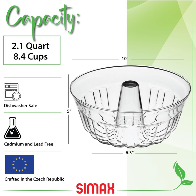 - EASY COOK AND STORE. Bundt pan can withstand temperatures between 572° and -40° Fahrenheit (300°/-40° Celsius). Use it to cook your food and then place the leftovers in the fridge or freezer for convenient storage- transparent glass allows you to monitor the cooking process and easily identify leftovers. Baking dish measures 10-inches in diameter by 5-inches deep, and holds 2.1 quarts – it is the larger of two size pans produced by Simax. Microwave and dishwasher safe. Made from Cadmium and lead