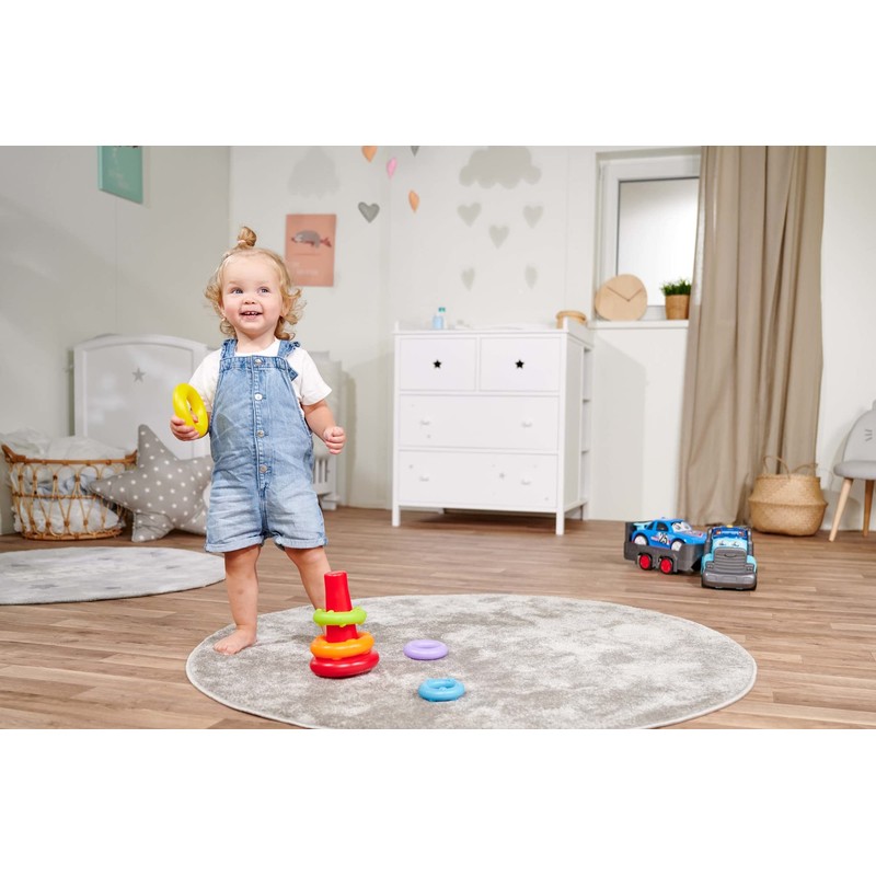 - With the ring pyramid, the little ones can stack the different coloured rings according to the size and the colourful cups can also be stacked into a tower
