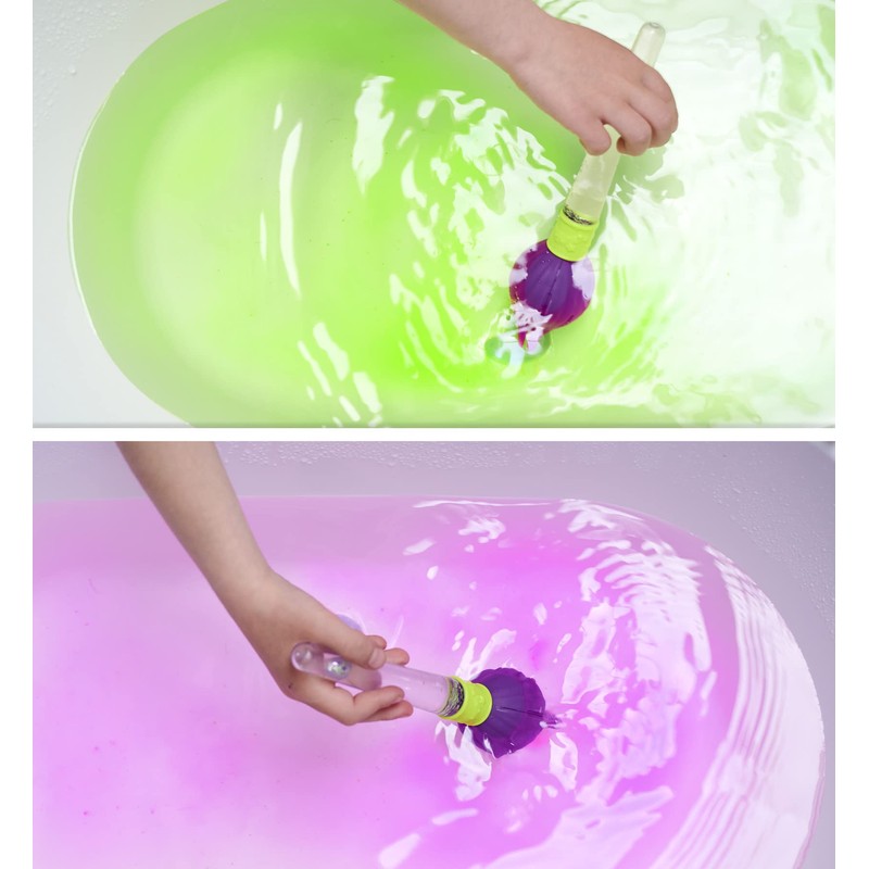 Add the bathwater additive to running water for a colorful and fun bath time experience.