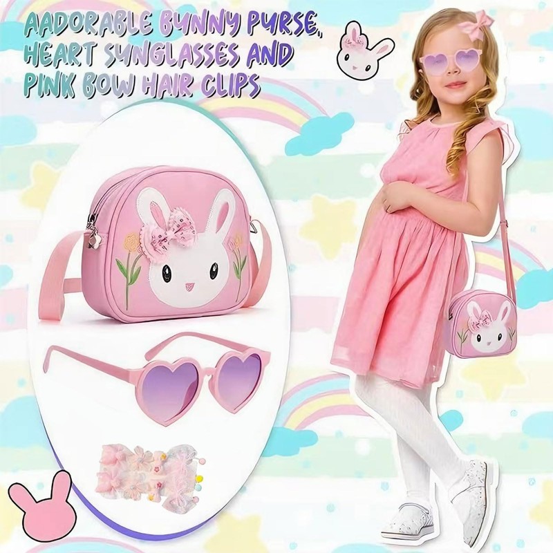 SIMDAO 10 Pcs Little Girls Handbag Set Adorable Rabbit Crossbody Bag with Heart-Shaped Sunglasses and 8 Bow Hair Clips, Kids Shoulder Bag Perfect for Kids' Birthday Gifts and Toys (Pink)