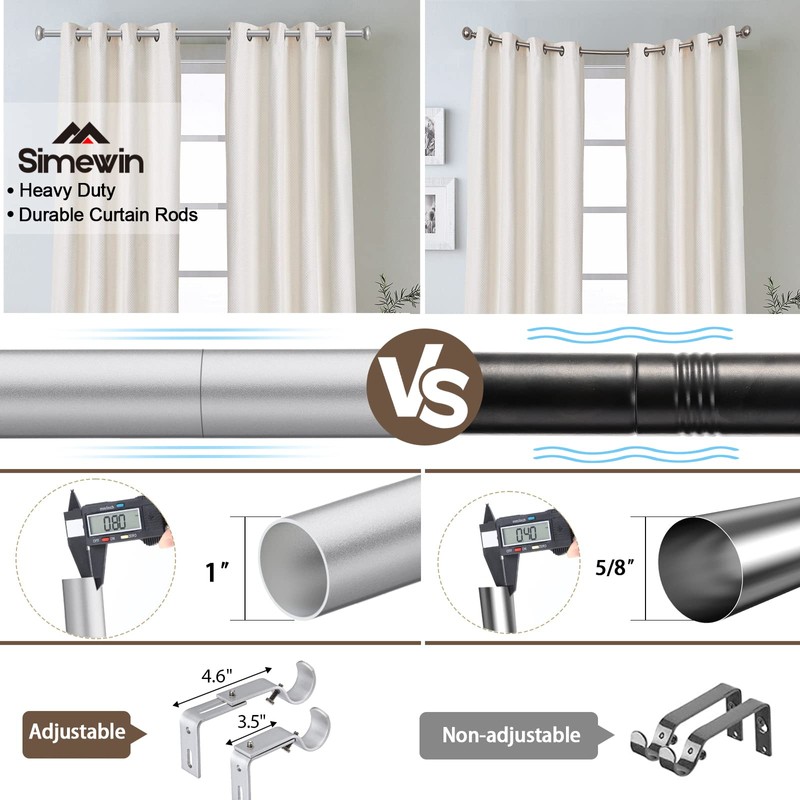 - 【Heavy Duty Curtain Rods】Sturdy and durable,SIMEWIN 1" diameter and 0.8mm thick metal curtain rod,weight capacity up to 30 pounds.Use the rod for anything from sheer flowing curtains to heavier insulating drapes. Each rod is treated with proven baking paint process, sturdy and durable,smooth surface.