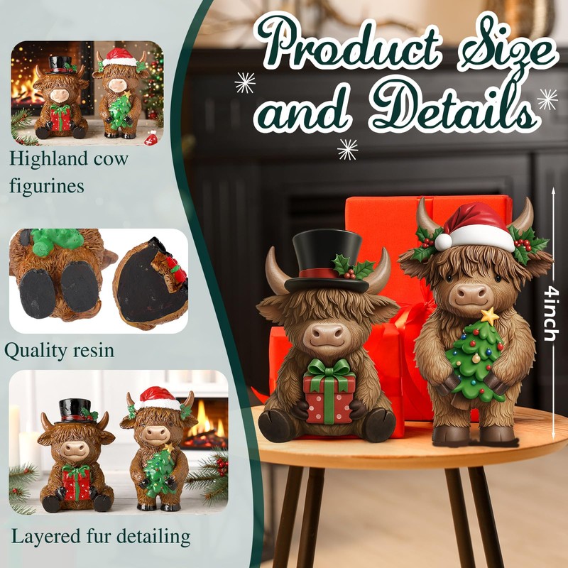 - Christmas Highland Cow Couple: featuring a fluffy highland cow with Christmas tree, gift box and classic Christmas tones, this adorable highland cow figurines for Christmas seamlessly blend into rustic farmhouse and holiday themes, adding cozy seasonal charm