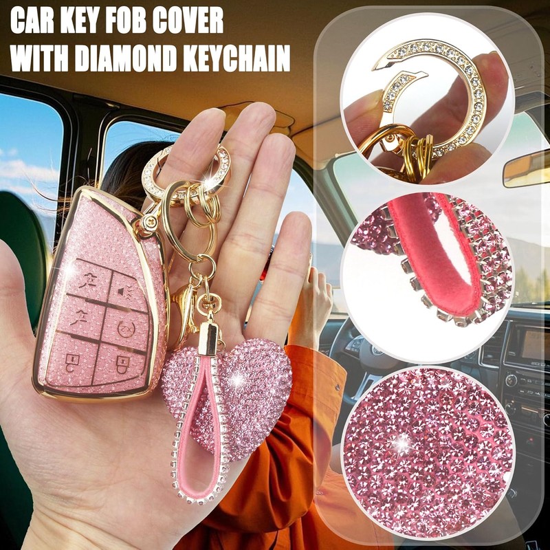 Simocky Key Fob Cover with Diamond Heart Keychain Car Key Shell Compatible with 2021-2024 Chevy Tahoe Suburban GMC Yukon Denali Silverado Buick Full Protector for Women (6 Buttons-Pink)