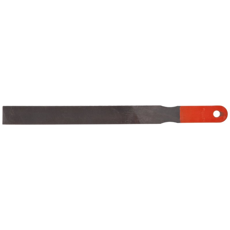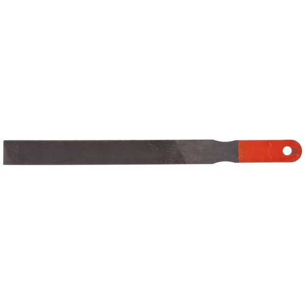 The Simonds coarse cut hand file is 10" long, has a handle, a black oxide coating, and a rectangular shape with double-cut American pattern teeth on one side and single-cut American pattern teeth on the other for smoothing and shaping straight surfaces. The double-cut teeth are for rapid material removal, and the single-cut teeth on the reverse side are for finishing, sharpening, and deburring. The file has no teeth on one edge to protect adjacent surfaces. The file's black oxide coating helps provide greater resistance to loading and rust than uncoated files. A paddle-shaped handle is forged on the end of the file for secure gripping.