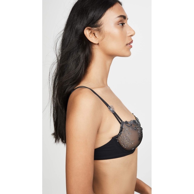 - Demi bra with sheer tulle cups featuring floral embroidery and double adjustable straps accented with floral embellishment