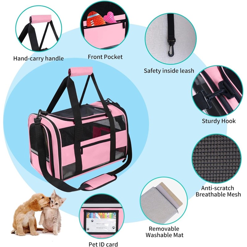 • Airline Approved Carrier Bag- With airline-approved design, you can take your pet to go to everywhere. This pet carrier provides two connecting loop handles for balanced carrying as a dual seat belt or luggage strap to secure transport