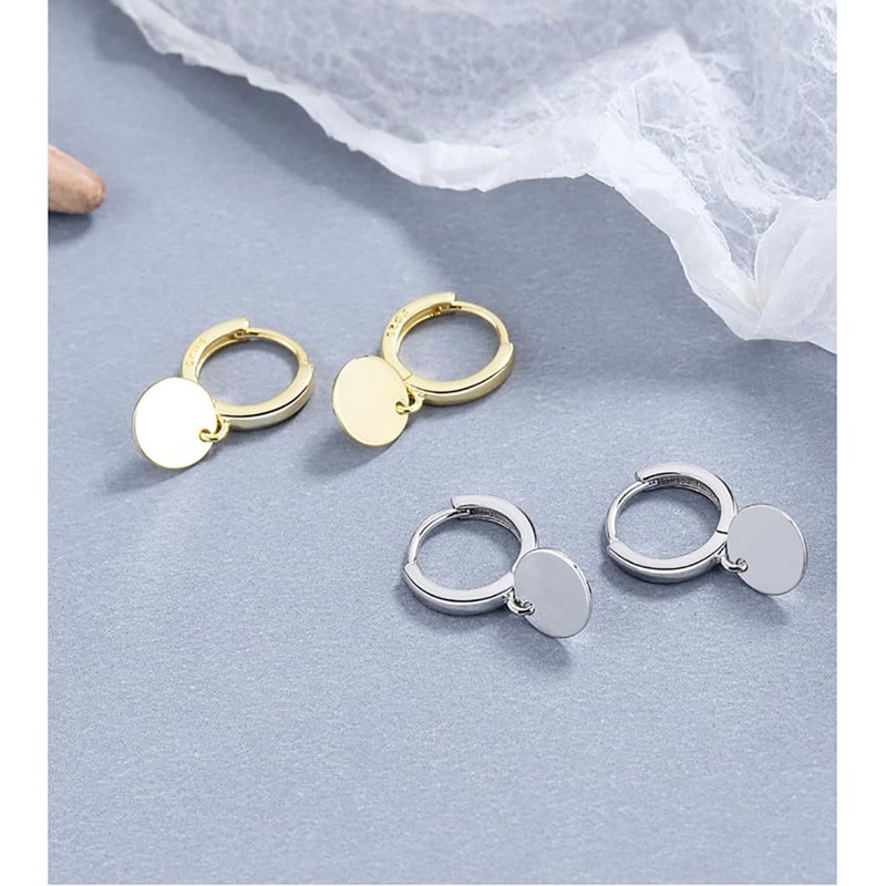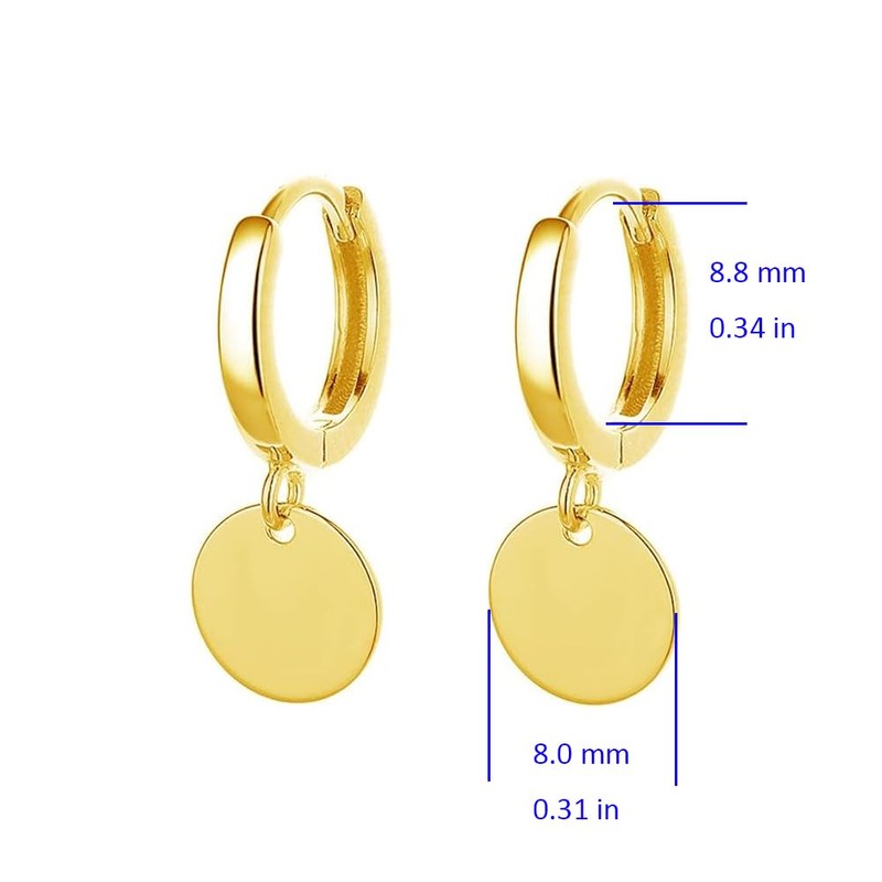 - Circle Disc Dangling Huggie Hoops Earrings Size: Inner diameter: 8.8mm. Outer diameter: 11.6mm. Coin: 8mm.