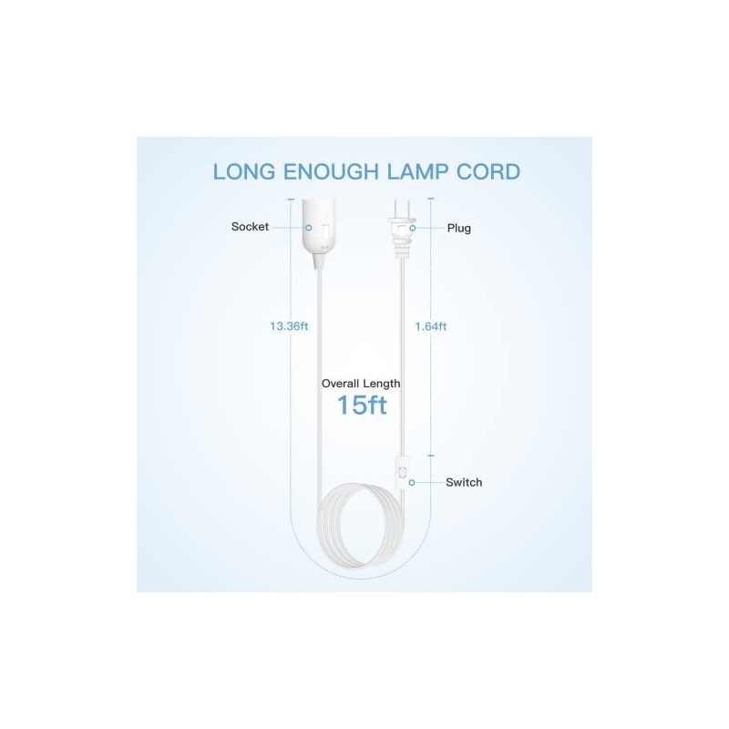 - Extension cable: 15 feet long satisfies for most hanging light applications; Fits standard E26/E27 Socket and On/Off toggle switch; Max Wattage: 360W, 120V-250V
