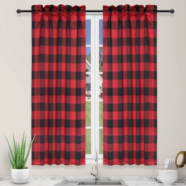 Simple Deluxe Buffalo Check Kitchen Tier Curtains, Plaid Gingham Small Curtain for Half Cafe Windows, 26" W x 45" L, Black and Red