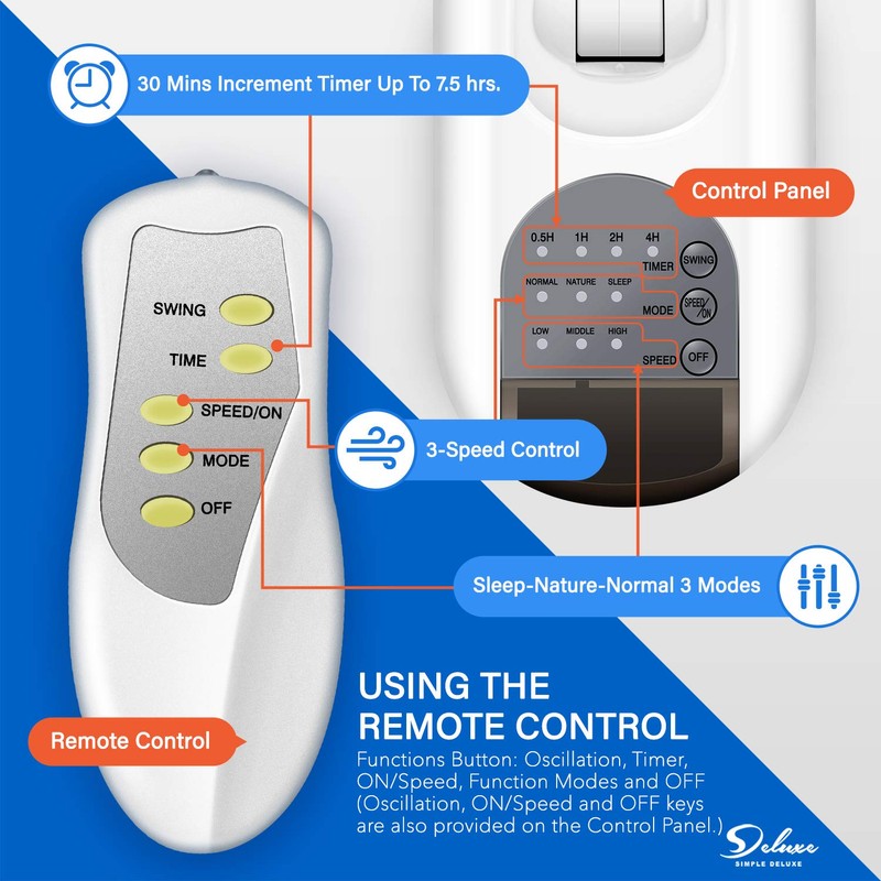 - Fan controls 3 modes, 3 speeds, up to 4 hour increment timer and oscillation. Built-in thermal overload protection