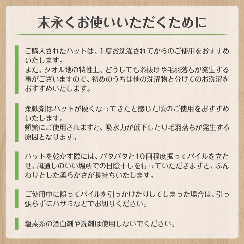 - [Warm Tips] Due to the characteristics of cotton products, there may be some fuzz. ■We recommend washing once before use. ■ Excessive use of fabric softener may lead to shedding and reduced absorbency, so we recommend using it when you feel the towel becomes hard. ■ Please refrain from using chlorine bleach or chlorine detergent as this may fade or discolor