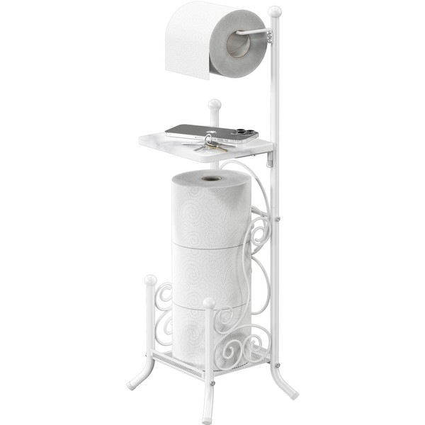 Simple Houseware English Style Bathroom Toilet Tissue Roll Holder Stand with Shelf, White