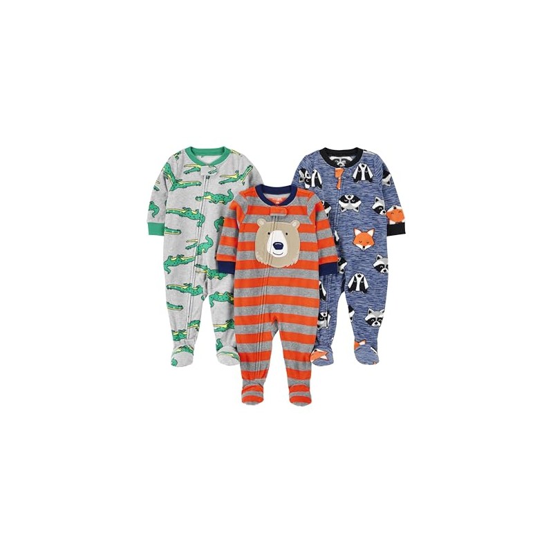 Simple Joys by Carter's Boys' 3-Pack Loose Fit Flame Resistant Fleece Footed Pajamas, Bear/Alligator/Fox & Racoon, 12 Months