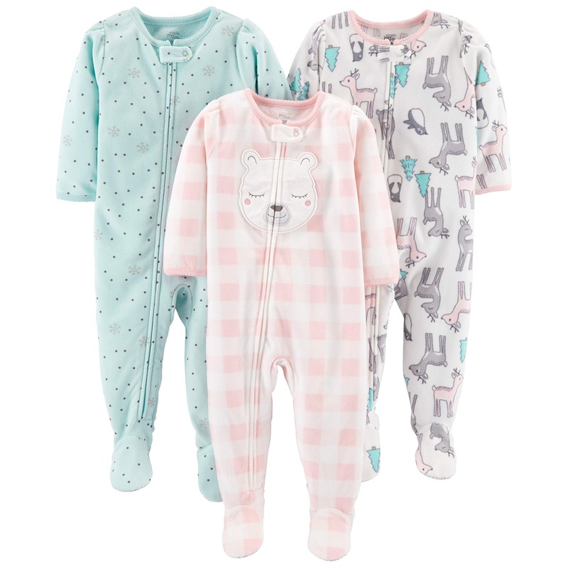 - Three sets of gripper-foot pajamas featuring fun patterns and appliques