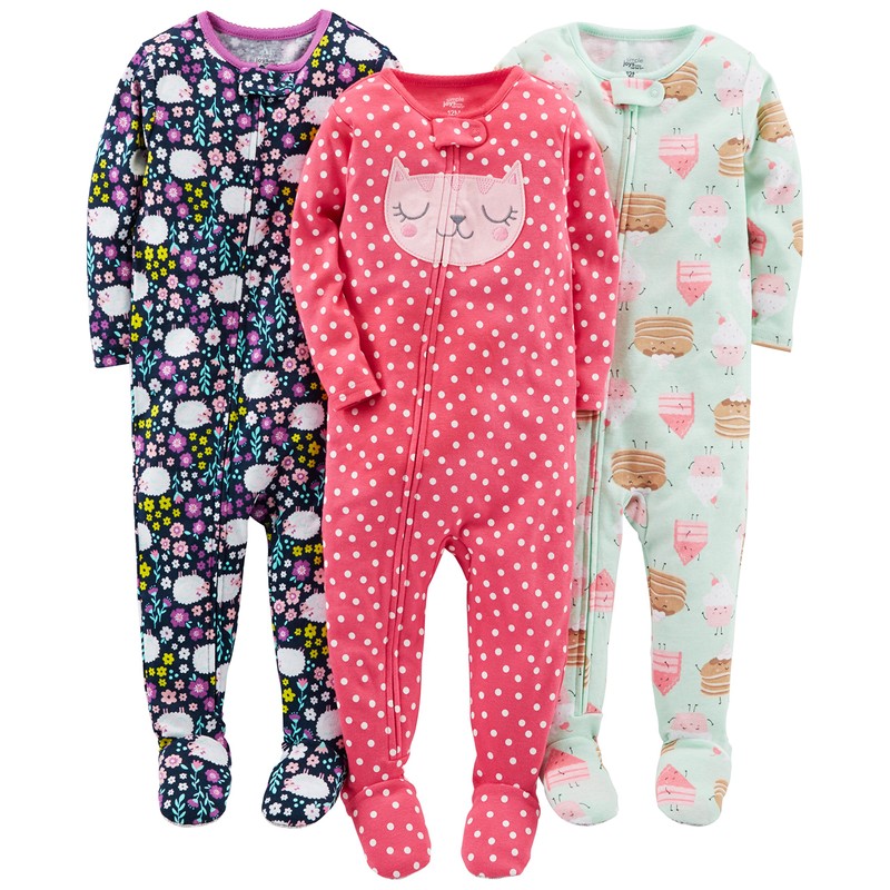 • Three sets of gripper-foot pajamas featuring fun patterns and appliques