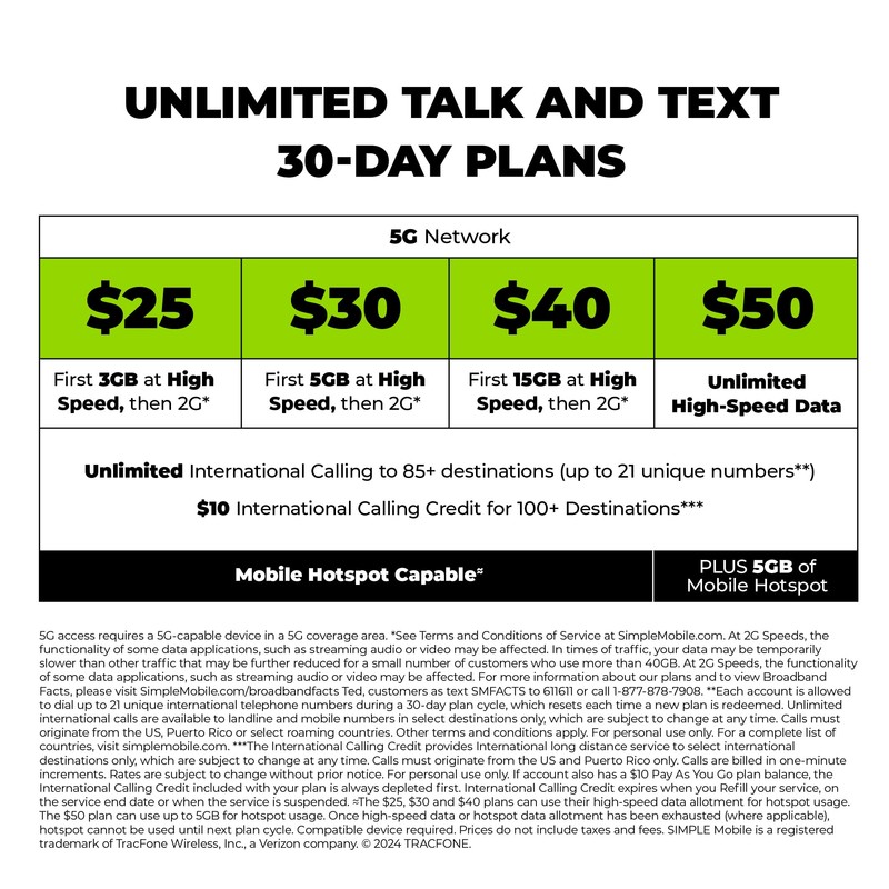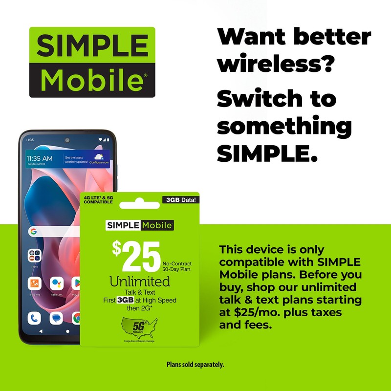 - Compatible with SIMPLE Mobile data and unlimited talk & text plans starting at $25/mo plus taxes and fees. To find the SIMPLE Plans available to purchase, please go to our SM - Amazon Brand Page linked below the product title.
