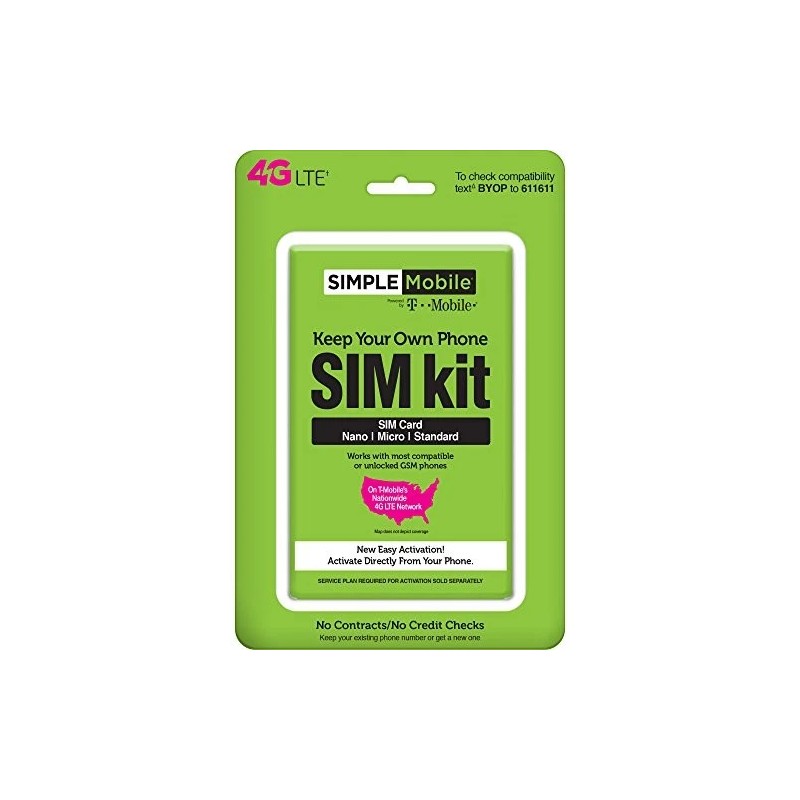 Also known as a bring your own phone (bop) kit, this activation kit allows you to convert your current Compatible or unlocked phone into a prepaid phone. This activation kit is Compatible with T-Mobile phones with micro, standard, or micro SIM cards. stream on! stream on! $50 for truly unlimited talk, text, & 4G LTE data Watch, listen, and play the way you want with a 30-day unlimited plan. Blazing-fast nationwide coverage it's Simple Mobile, powered by T-Mobile. Get high-speed 4G LTE coverage Coast to Coast.