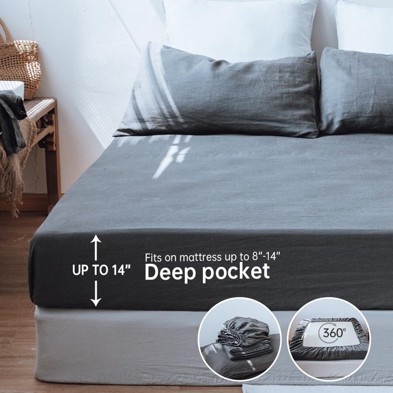 ~The 100 percent pure linen sheets & pillowcase sets The fitted sheet is the perfect thickness, with all-round elastic to ensure a secure fit, and has deep pockets (up to 15 inches) to fit your mattress without shifting, and keep the bed flat and comfortable even in deep sleep.