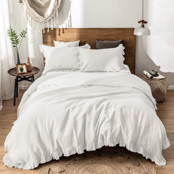 Simple&Opulence 100% Linen Stone Washed Euro Sham with Ruffle 26x26 Inch Pillow Cover Set of 2 (White, 26"x26")