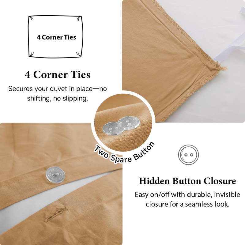 - [Thoughtful Details] Designed with 4 interior corner ties to keep your duvet securely in place all night. Features a hidden button closure with a protective flap for a seamless look and added durability. No slipping, no bunching—just uninterrupted comfort.