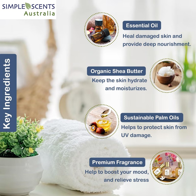 Indulge in the Luxury of Simple Scents Australia Soap bars Box, a set of 3.5 Oz scented natural soap bars. Completely chemical free bath soap bars, naturally derived from plant oils - Made for men and women.