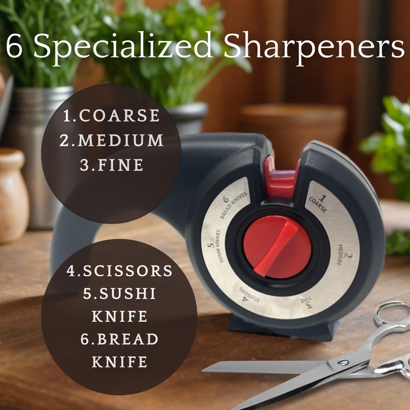 • 6 SPECIALIZED SHARPENERS: Coarse, medium, and fine for knives of all types, and dedicated sharpeners for scissors, sushi knives, and bread knives, ensure every blade in your collection receives the perfect treatment.