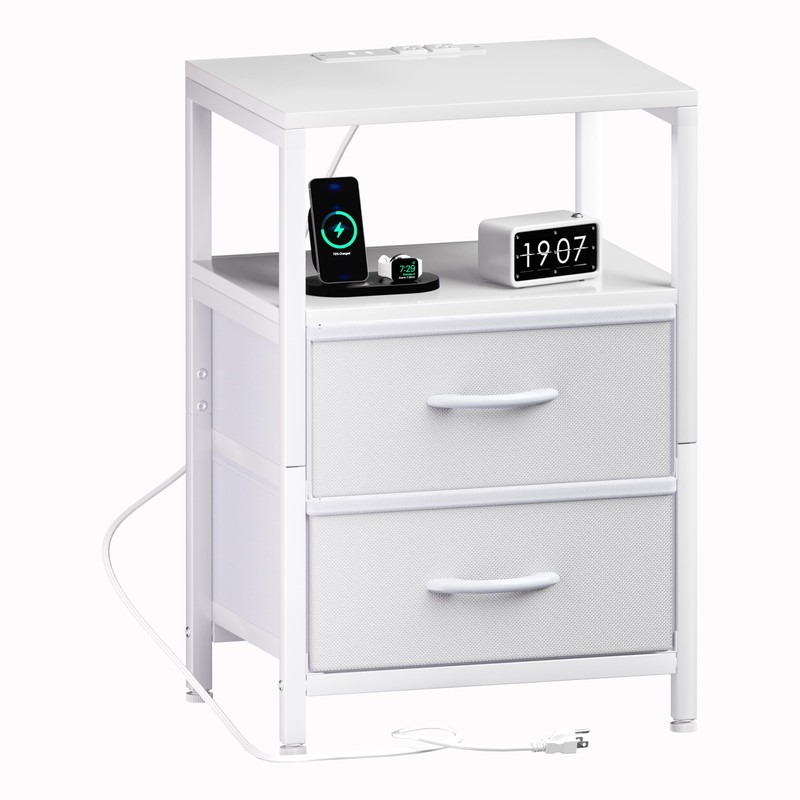 Simple Trending Nightstand with Charging Station, Side Table with Fabric Drawers, EndTable with Open Shelf, Bedside Table with USB Ports and Outlets, Night Stand for Bedroom, White