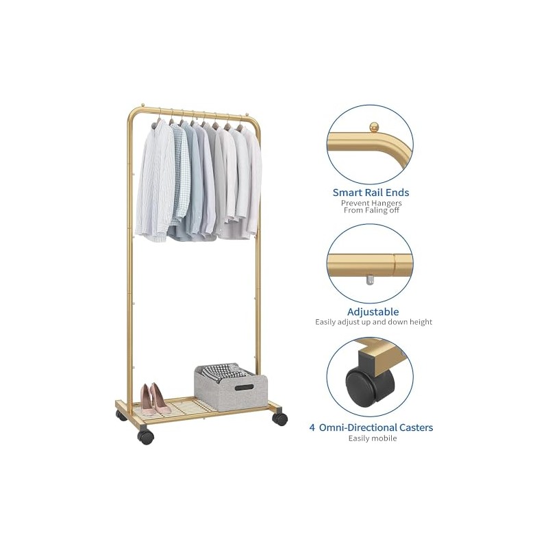 Simple Trending Standard Clothing Garment Rack, GoldAre you bothered and need a simple clothing storage to tidy up your clothes quickly?Simple Trending clothing storage make easy. Perfect for expanding your wardrobe or using as aspare open closet that add extra hanging storage space. It is great for laundry room, bedroom,even for display in a store or market.It is super easy to assemble and move! Heavy duty 360°wheels in bottom, it can be easily movedand rearranged to meet your needs. And the grid bottom shelf for shoes or boxes to create extra storage.Specifications:Material : MetalDimensions : 28.5”W x 14.75"D x 59"HColor : GoldLoad capacity : 120 lbsPackage Contents:1x Rack1 x Assembly Manual2 x wrenches