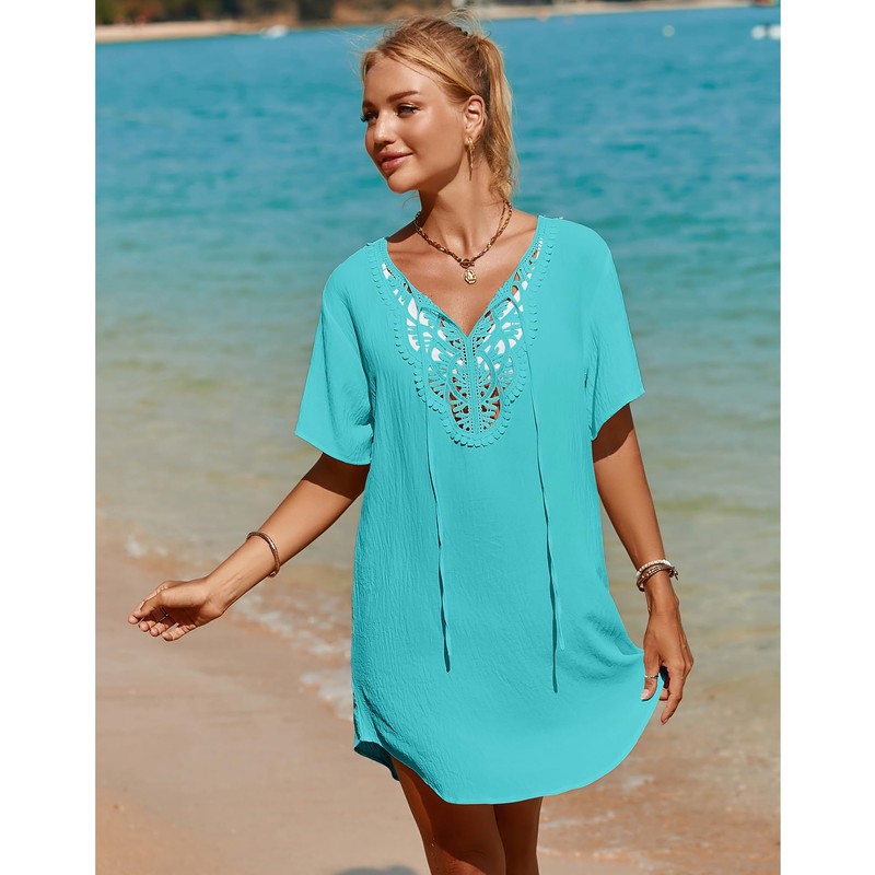 - Essential Wardrobe Addition: Bathing Suit Cover Up features v neck with lace crochet, short sleeves, drop shoulder, it's flattering for all body shapes.The length is just right to cover to mid-thigh, flowing, curved hem making this beach dress stand out