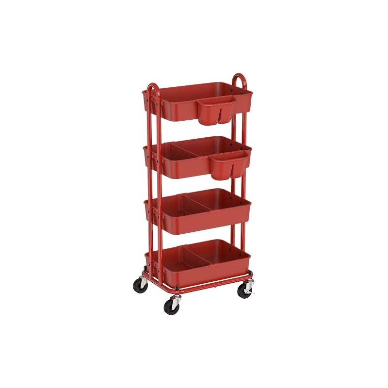 SimpleHouseware 4-Tier Multifunctional Rolling Utility Cart with Basket Dividers and Hanging Buckets, Red
