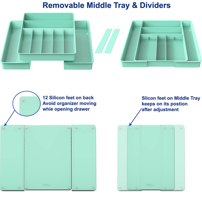- Removable middle tray allows this organizer transfornm into 3 pieces. Thus it can be used in 3 different size of drawers.