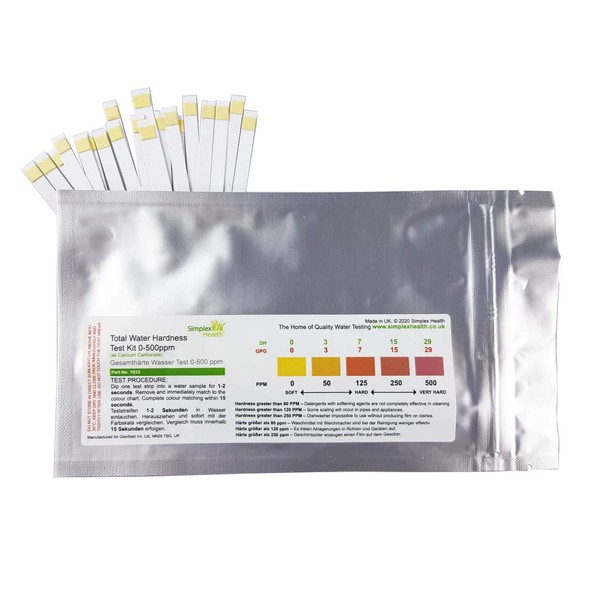 Simplex Health Total Hardness test strips are perfect to test the hardness of your water, they are ideal to check the performance of your water softener, for service work, classroom demonstrations, or to give to customers instead of an expensive service call. This full range test kit lets you measure hardness on a very wide range of 0ppm to 1000ppm (ppm = parts per million).