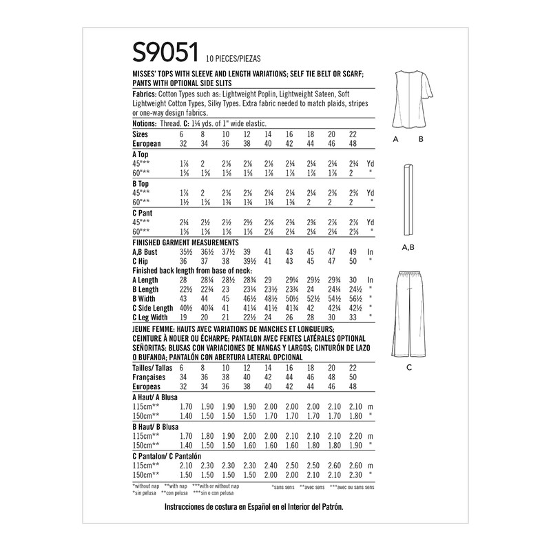 Simplicity Sewing Pattern 9051/R10432 Size H5 (6-14) Misses' Tops With Sleeve and Length Variations; Self Tie Belt or Scarf; Pants with Optional Side Slits