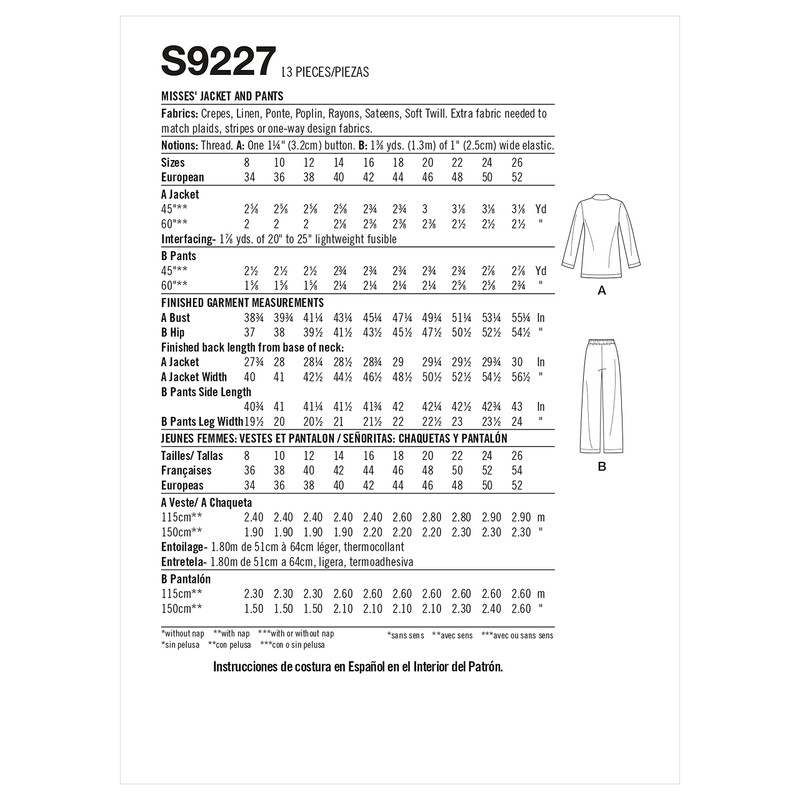 • Women's sewing pattern packet includes sewing templates, pattern pieces, fabric recommendations, sizing guides, and instructions for (1) jacket and (1) pair of pants.