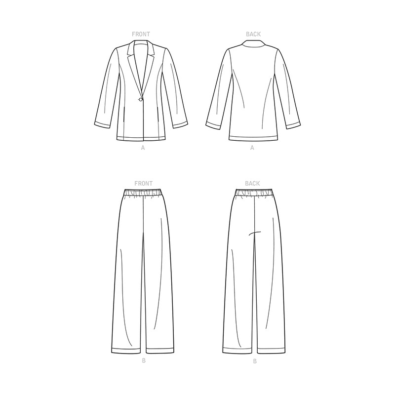 • Pull-on pants pattern are made with traditional straight legs, while unlined one-button jacket pattern features hidden pockets in the princess seams.