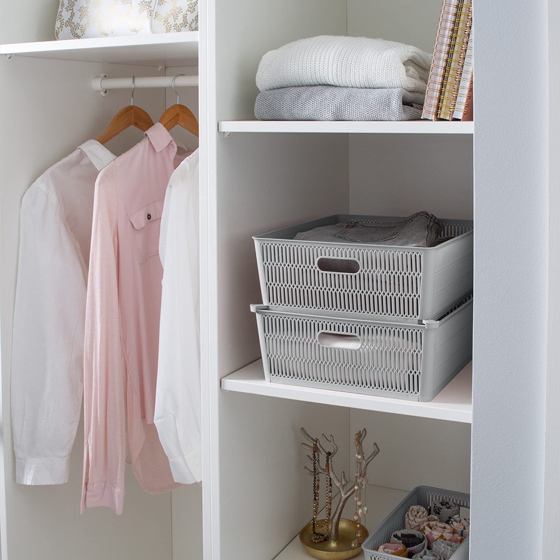 Simplify 2Pk Shallow Slide 2 Stack It Tote Basket | Storage & Organization | Open Bins with Stackable Capability | Bathroom | Crafts | Pantry | Playroom | Office | Gray